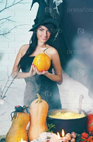Красивая ведьма варит зелье в котле