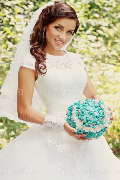 Красивая невеста с букетом из бирюзы