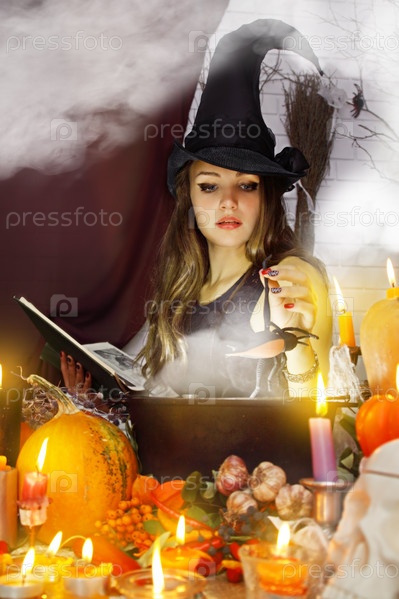 Красивая ведьма варит зелье в котле