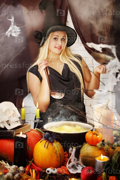 Красивая ведьма варит зелье в котле