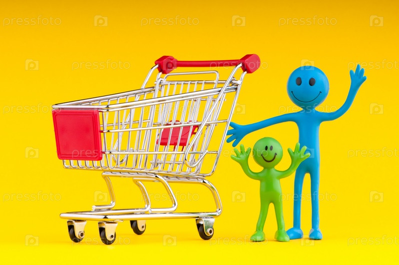 Покупательская тележка и радостные человечки на желтом фоне