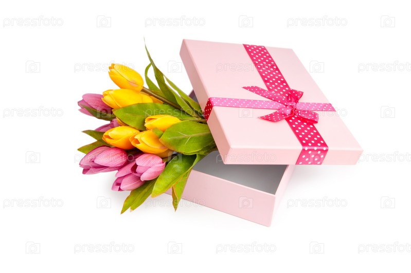 Подарочная коробка и букет тюльпанов