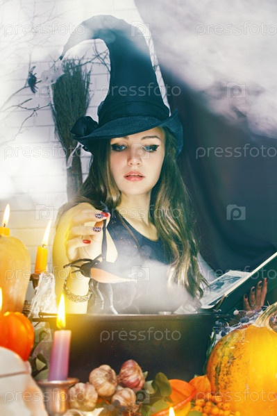 Красивая ведьма варит зелье в котле