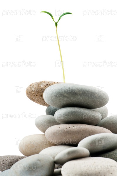 Круглые серые камни и зеленый росток на белом фоне