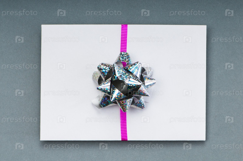 Карточка, перевязанная лентой, на сером фоне