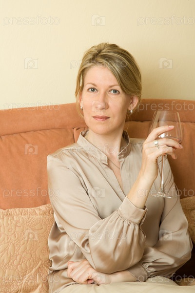 Молодая женщина с бокалом вина, сидящая на кровати