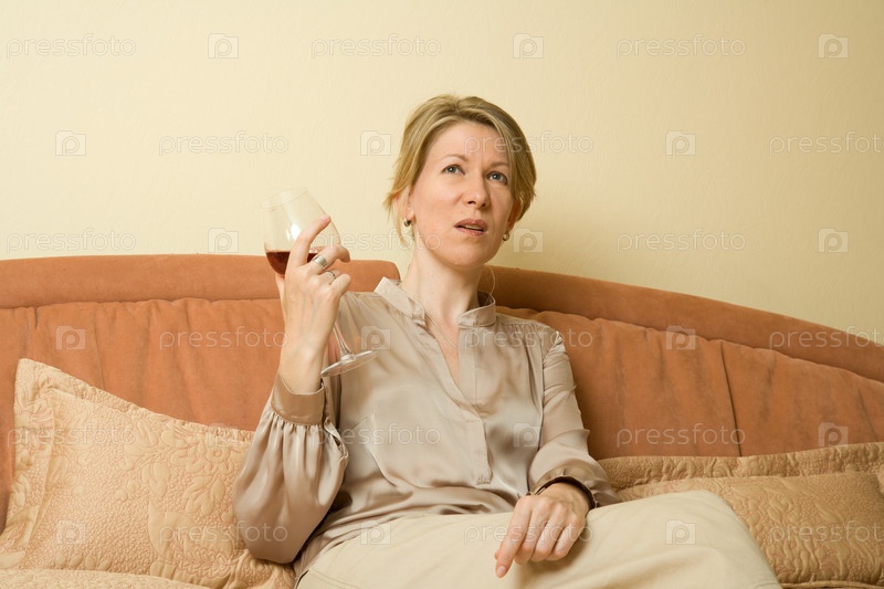 Молодая женщина с бокалом вина, сидящая на кровати