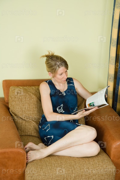 Молодая женщина, сидящая в кресле с журналом в руках