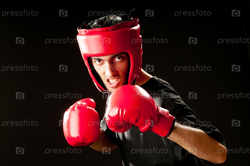 Мужчина в боксерских перчатках и шлеме на черном фоне
