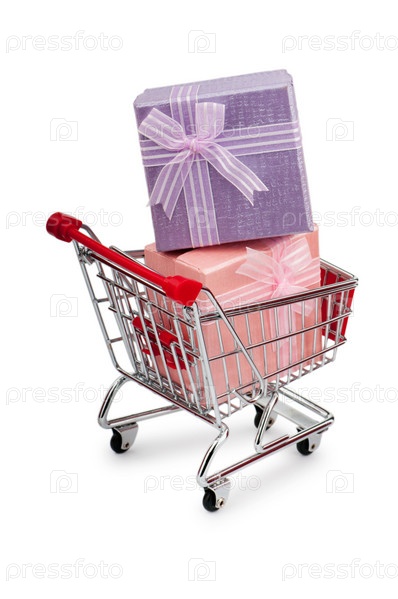 Подарочные коробки в тележке на белом фоне