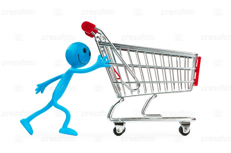 Синий человечек с продуктовой тележкой на белом фоне