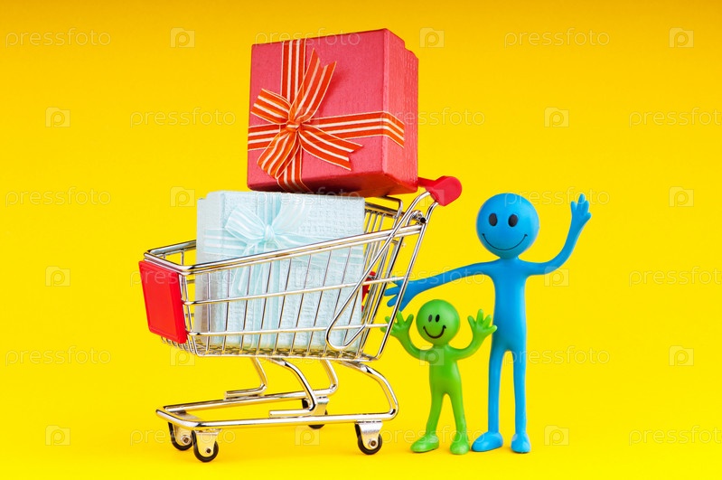 Счастливая семья у тележки с подарками на желтом фоне