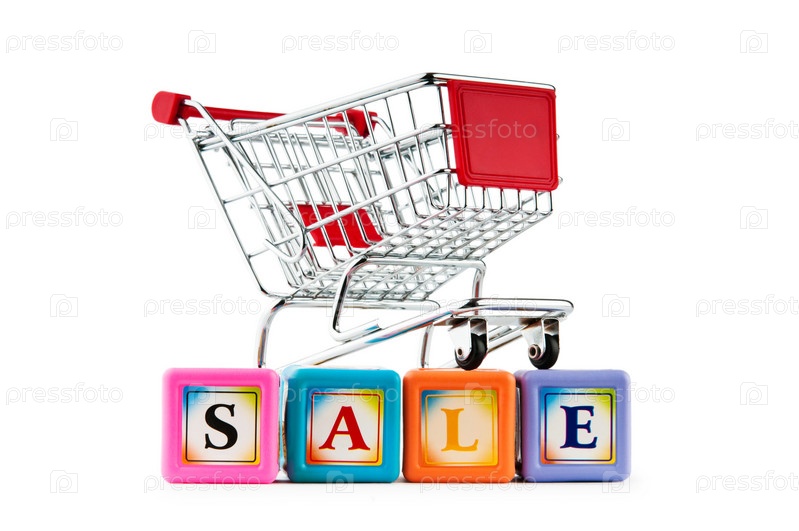 Торговая тележка и слово 'продажа' на белом фоне