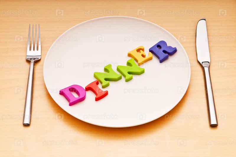 Столовые приборы и тарелка, с выложенным на ней словом "ужин"