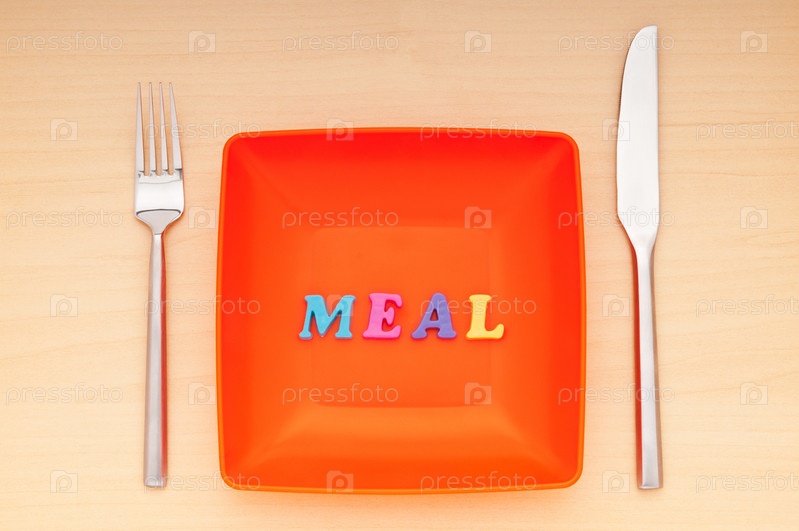 Столовые приборы и тарелка, с выложенным на ней словом "еда"