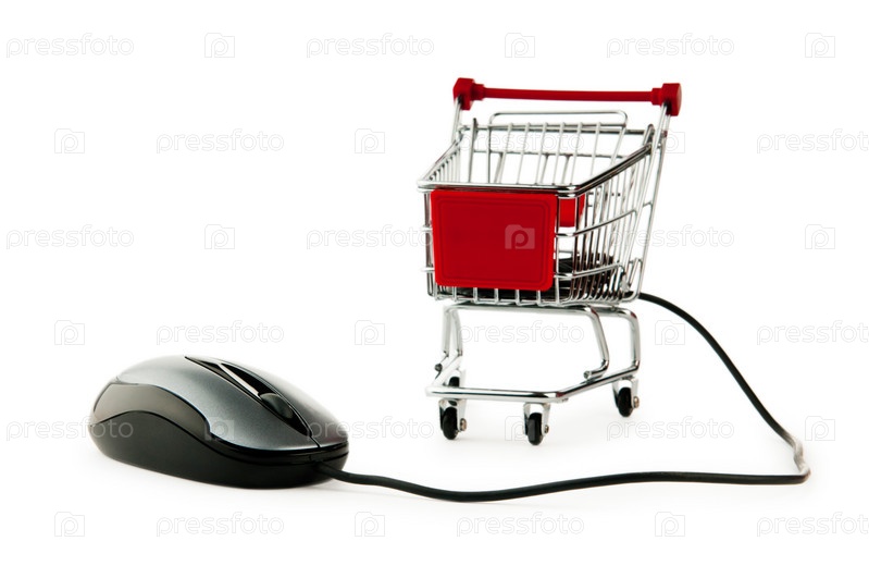 Концепция онлайн-покупок - компьютерная мышь и покупательская тележка на белом фоне