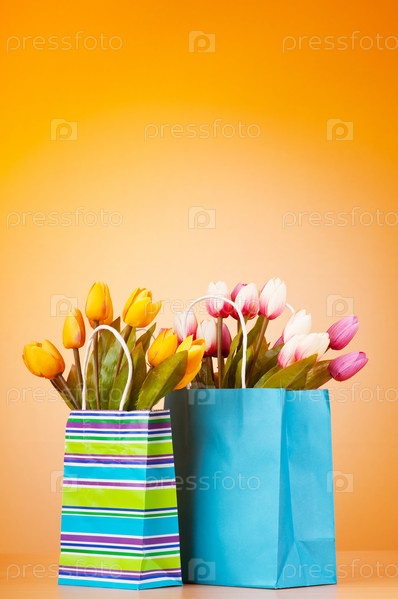 Тюльпаны в бумажных пакетах на желтом фоне