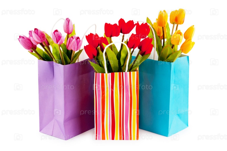 Тюльпаны в бумажных пакетах на белом фоне