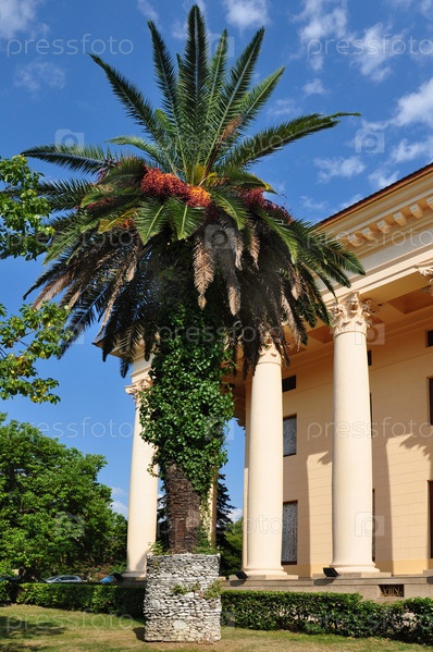 Финиковая пальма у здания с колоннами на фоне синего неба