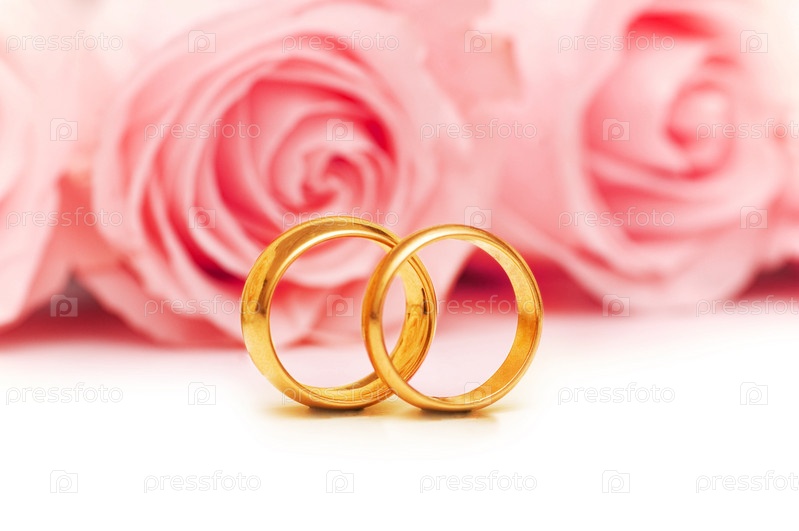 Обручальные кольца и розы на белом фоне