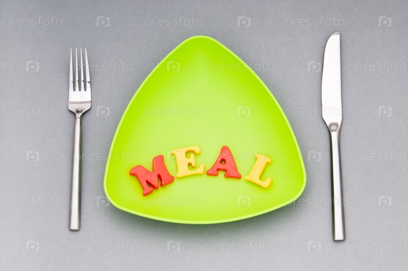 Вилка, нож и тарелка с надписью 'meal' на сером фоне
