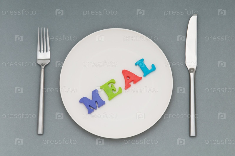 Вилка, нож и тарелка с надписью 'meal' на сером фоне