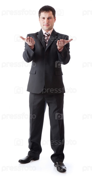 Бизнесмен с протянутыми руками ждет чего-то, на белом фоне