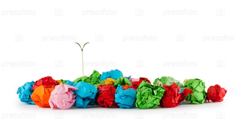 Росток на скомканной бумаге. Концепция переработки бумаги