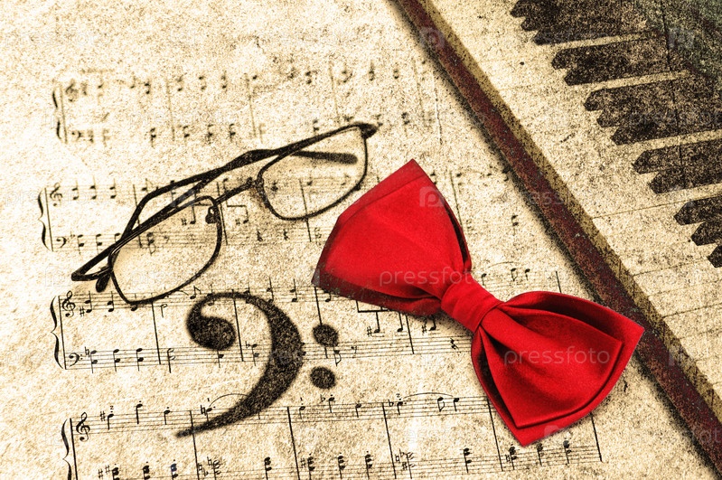 Очки и красный галстук-бабочка на грязной бумаге с нотами для фортепиано