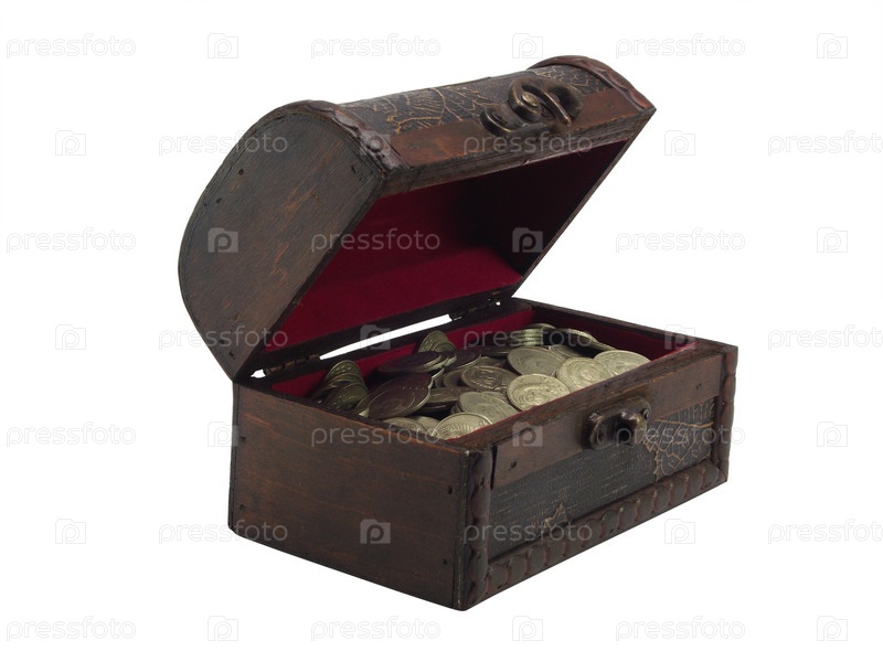 Антикварный деревянный сундук с монетами на белом фоне