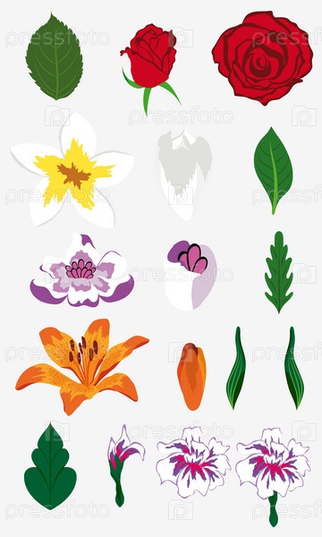 Набор разных цветов и листьев на белом фоне