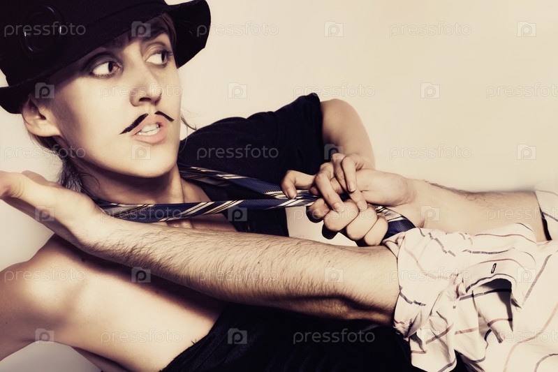 Молодая женщина в черной шляпе и нарисованными усами борется с мужчиной