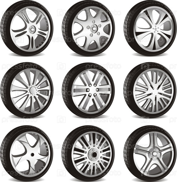 Набор автомобильных колес на белом фоне