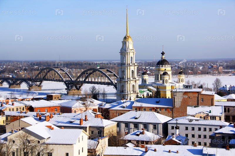 Вид на Спасо-Преображенский собор и Волжский мост в Рыбинске зимой