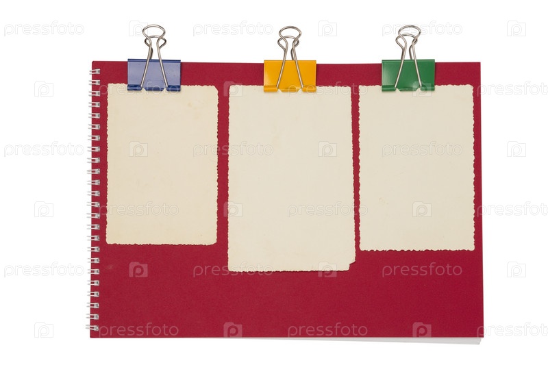 Пустые фото на красном блокноте с пружиной. Изолированные на белом фоне