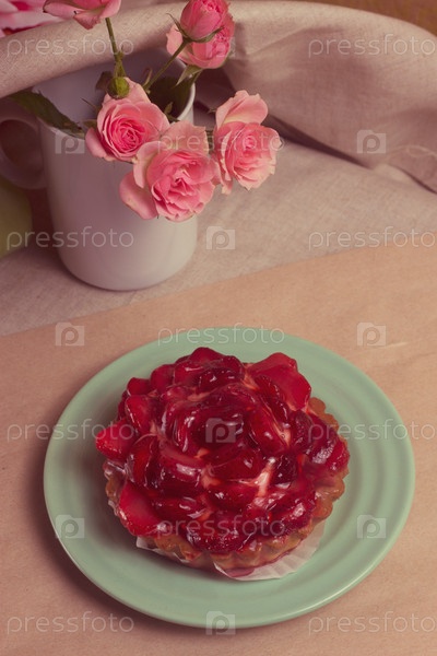 Клубничный пирог и букет роз