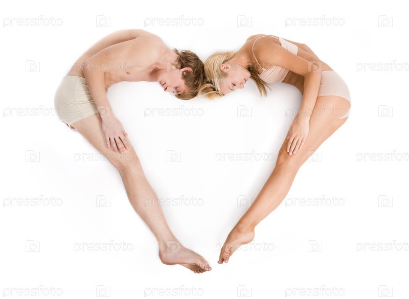 Творческое изображение супружеской пары, лежащей и формирующей сердце на белом фоне