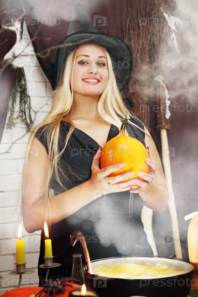Красивая ведьма варит зелье в котле