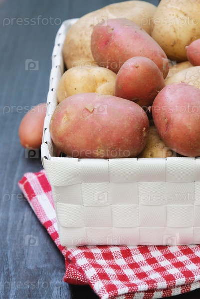 Урожай молодого картофеля в корзине на столе