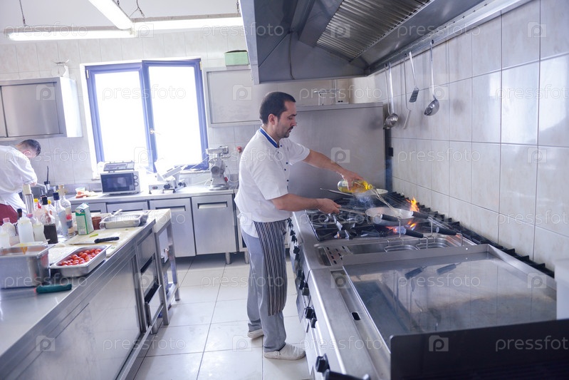Шеф-повар готовит блюдо в кухне