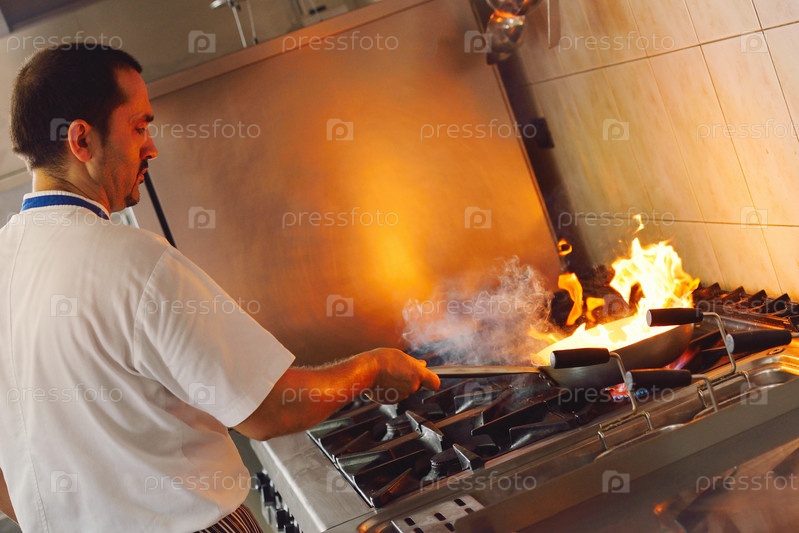Шеф-повар готовит блюдо в кухне