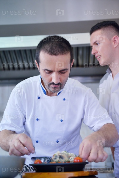 Шеф-повар готовит блюдо в кухне