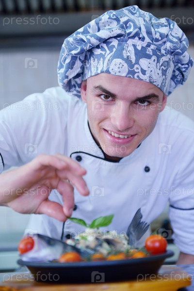 Шеф-повар готовит блюдо в кухне