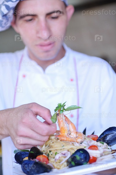 Шеф-повар готовит блюдо в кухне