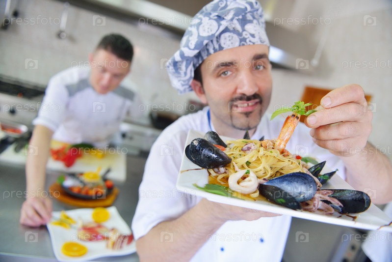 Шеф-повар готовит блюдо в кухне