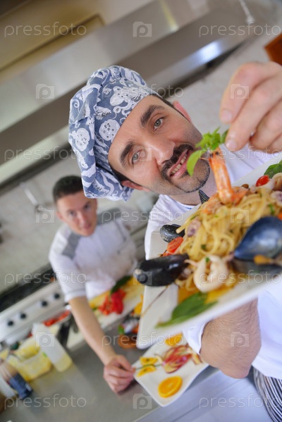 Шеф-повар готовит блюдо в кухне