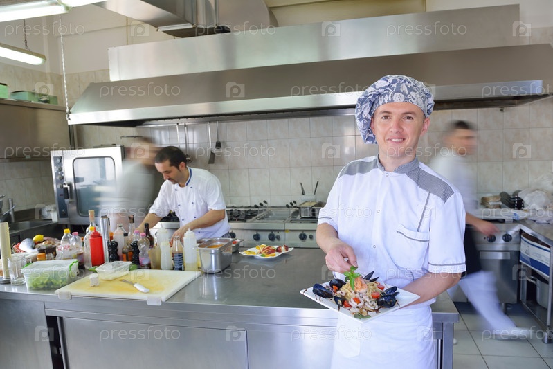 Шеф-повар готовит блюдо на кухне