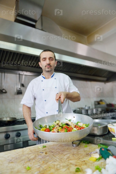 Шеф-повар готовит блюдо на кухне