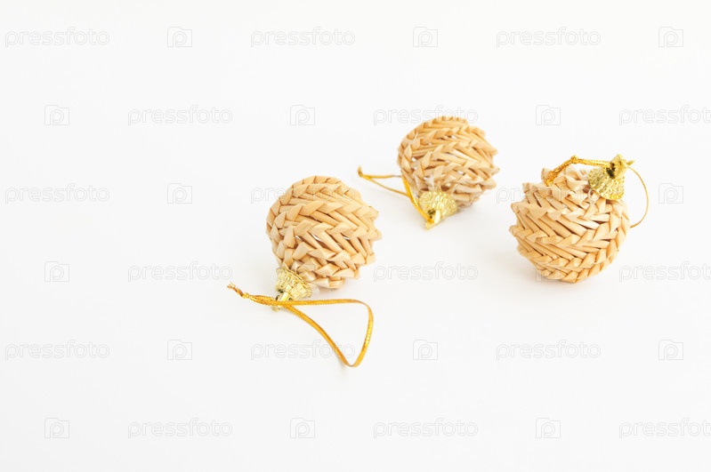 Три плетенных из соломы елочных шарика на белом фоне