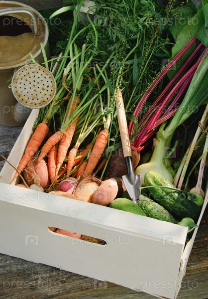 Свежие овощи в белом ящике и лейка